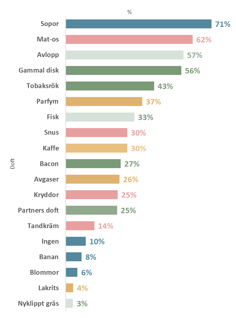 70% av de gravida är mest känsliga mot lukten av sopor. På andra plats kommer doften av mat! Och hälften är extra känsliga mot lukten av gammal disk. 25% svarar dessutom att de är känsliga mot partnerns doft.