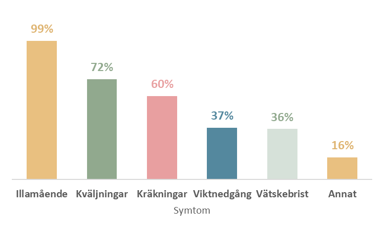 Här ser du de vanligaste symtomen bland dem som deltagit i Kräkbarometern (man kan förstås ha flera av dessa symtom).